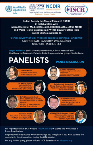 Indian Council of Medical Research (ICMR)-National Centre for Disease Informatics and Research (NCDIR), WHO Country Office for India, and Indian Society of Clinical Research (ISCR) jointly organized a Webinar on ethics review of biomedical projects during a pandemic, to bring the focus on the need of quality research outcomes and adopting new research methodologies to respond to humanitarian emergencies.