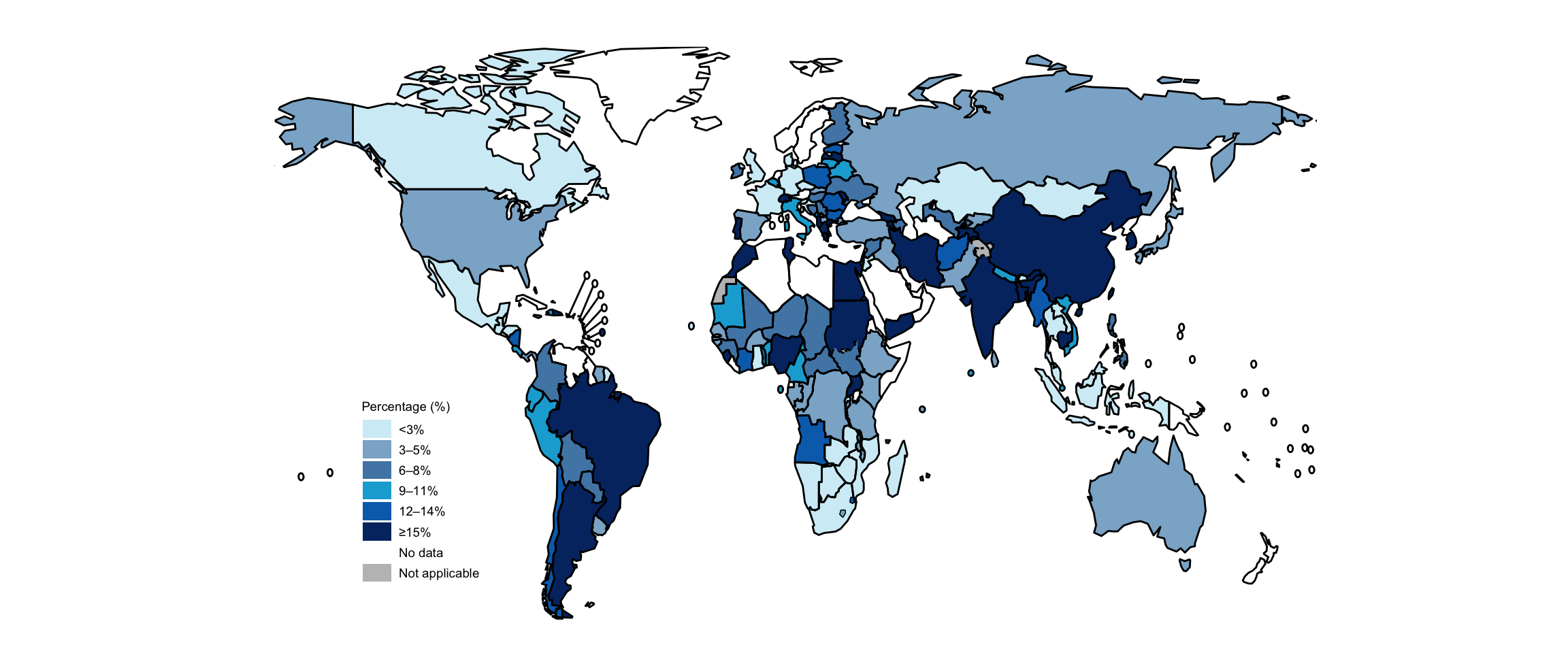 In contrast to improvements in the SCI, the level of financial protection for expenditures on health has worsened. Globally, the proportion of the general population facing catastrophic expenditures on health (using a threshold of >10% annual household income or expenditure) rose from 9.4% in 2010 to 12.7% (927 million people) in 2015 (11). National values are available for different years and there is more geographical variability compared with the SCI, including within regions (Fig. 6.1.3).